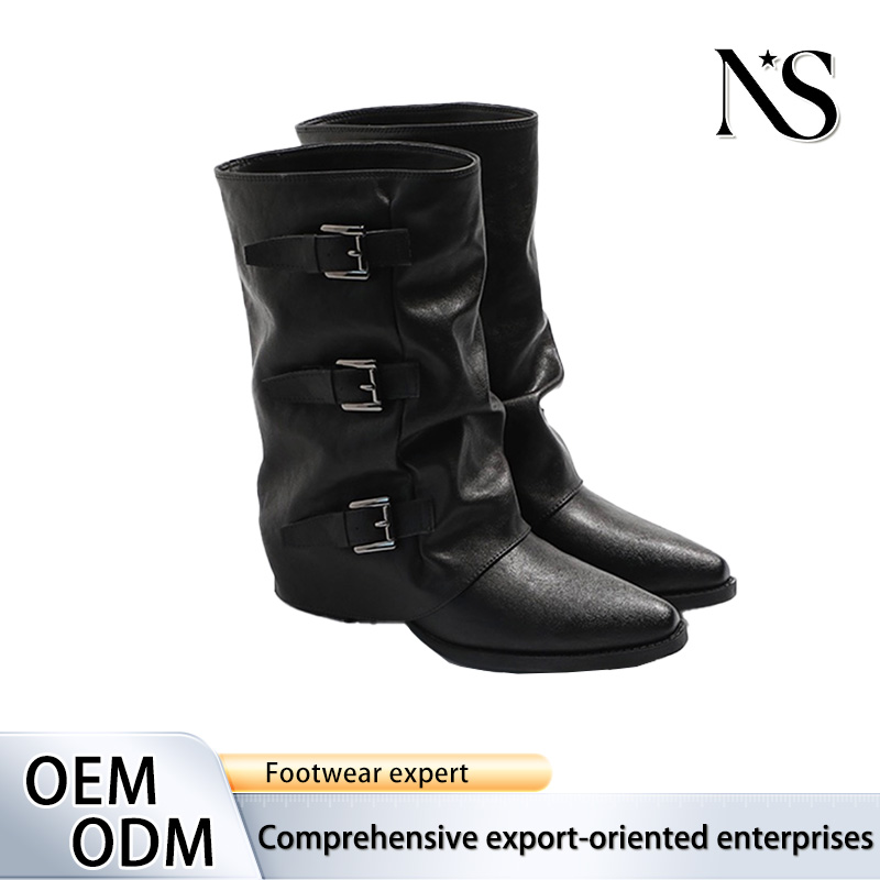 As três fileiras de tiras metálicas com fivelas no corpo da bota são o foco visual: as fivelas prateadas contrastam fortemente com o couro preto, amplificando a atmosfera ousada. O salto baixo de aproximadamente 3 cm possui tratamento antiderrapante, oferecendo melhor estabilidade do que botas rasas normais, estilo de equilíbrio e praticidade.