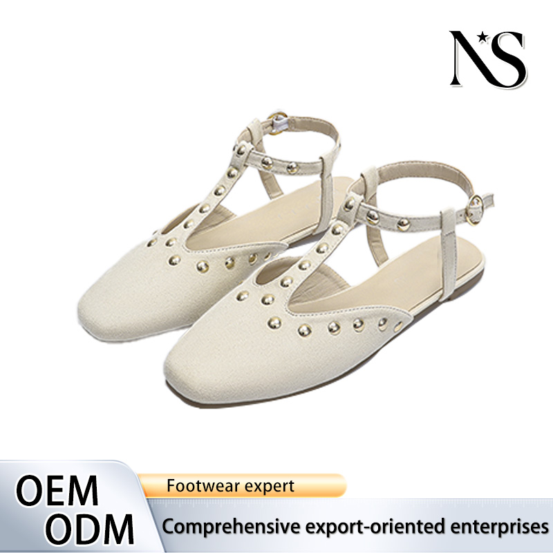 Apresentando as sandálias planas com alça em T bege com rebite, uma fusão perfeita de charme vintage e toque moderno. Estas sandálias apresentam um tom bege suave adornado com rebites de metal elegantes, combinados com um design clássico de tira em T, tornando-as uma adição versátil e elegante a qualquer guarda-roupa de verão.